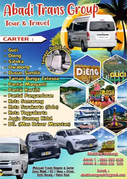 Layanan travel, carter, dan sewa mobil terpercaya dengan armada lengkap dan supir berpengalaman. Melayani perjalanan reguler, wisata, hingga pengiriman barang.